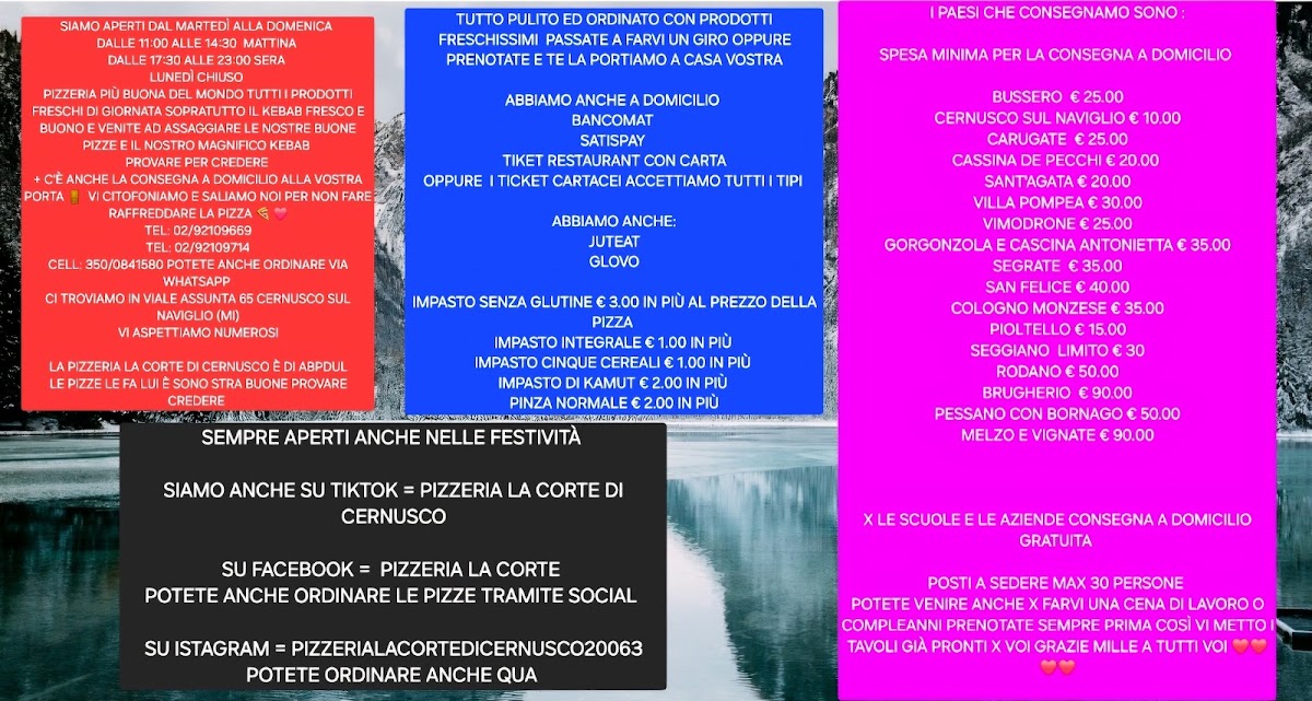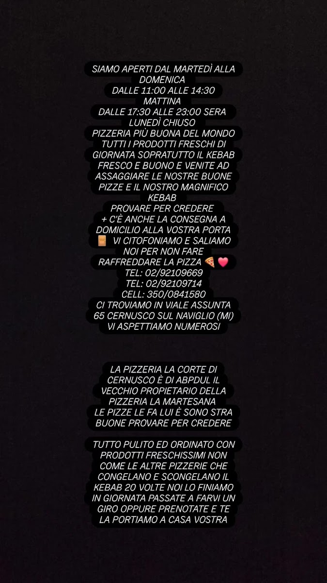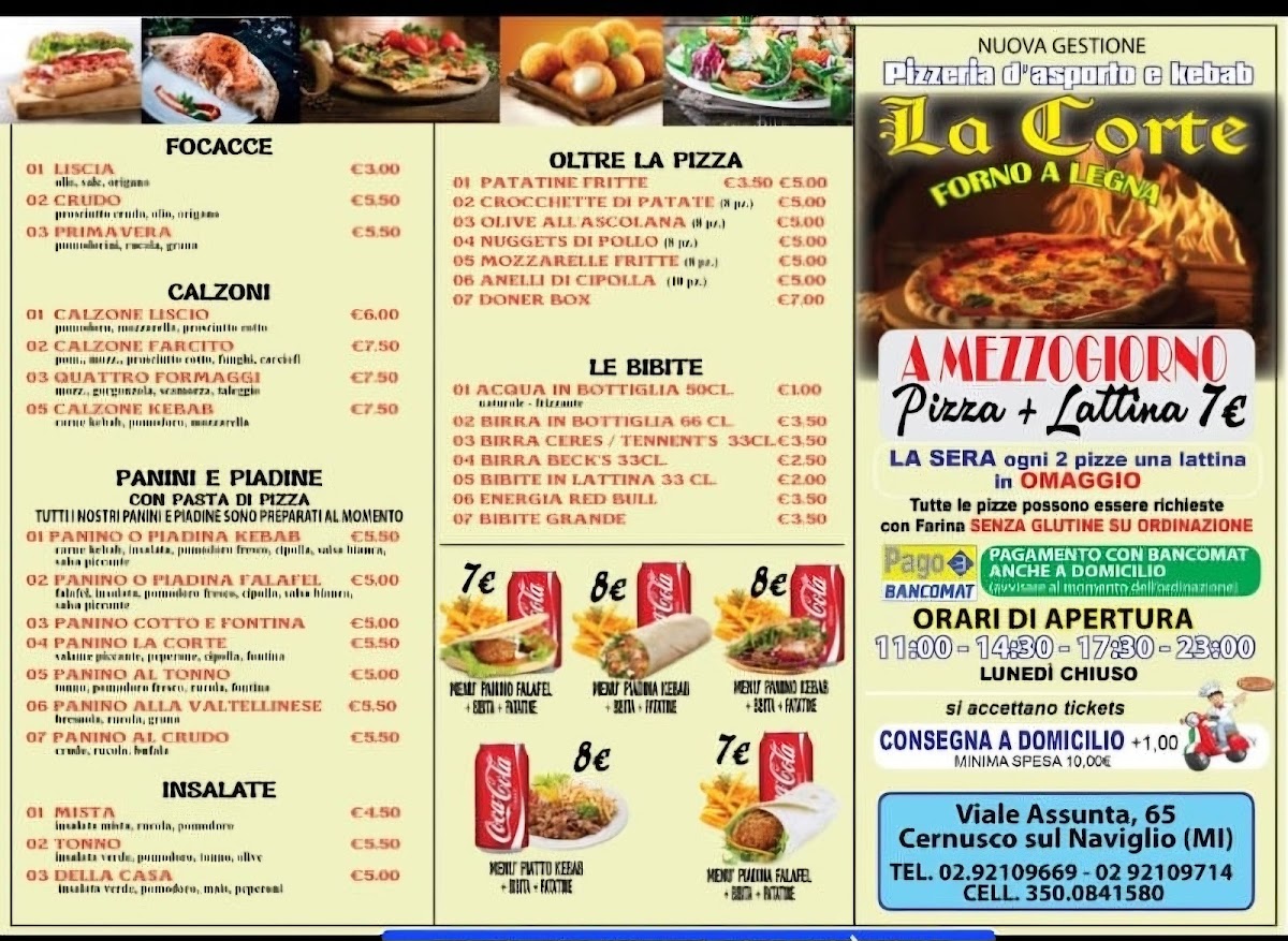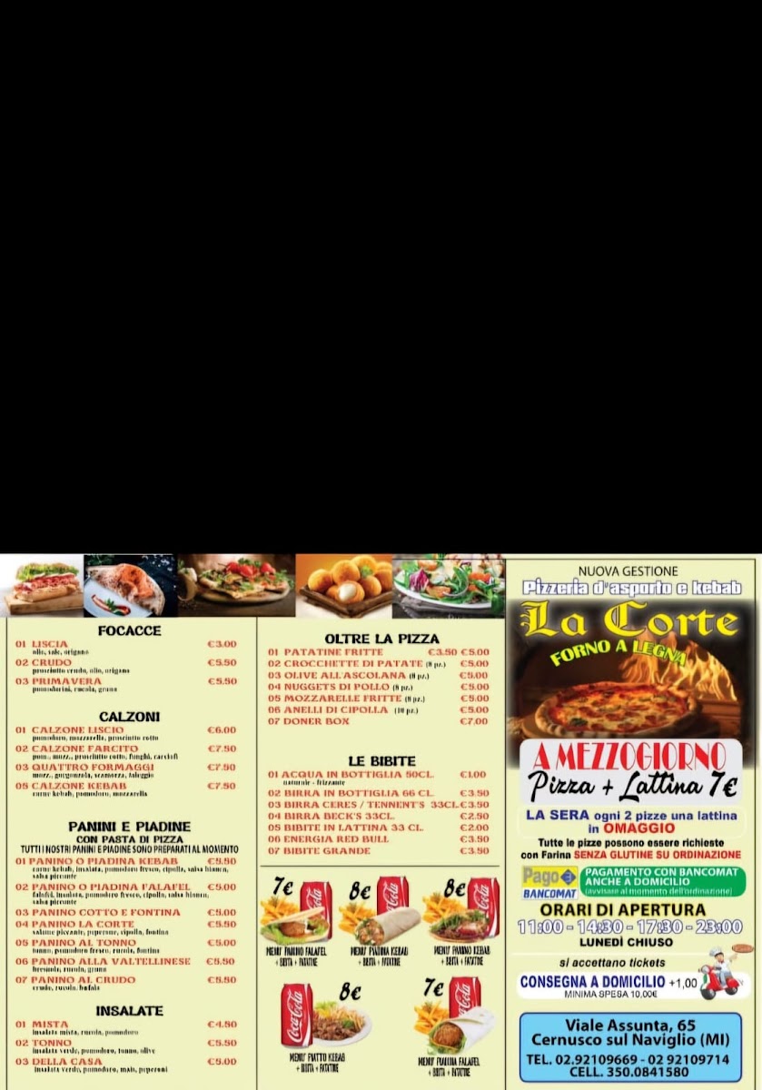 Welcome to La Corte Pizzeria Kebab, a culinary gem nestled in the heart of Cernusco sul Naviglio. This bustling eatery on Viale Assunta offers an irresistible menu that marries traditional Italian flavors with the robust taste of kebabs. Customers rave about the quality—Marco Milani describes the pizzas and kebabs as "buonissimi e di alta qualità," underscoring the freshness of the ingredients.